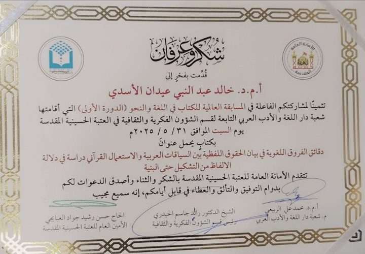 حصل التدريسي في كلية العلوم الإسلامية بجامعة كربلاء، الأستاذ المساعد الدكتور خالد عبد النبي على كتاب شكر وتقدير، وذلك لمشاركته المتميزة في المسابقة العالمية للكتاب في اللغة والنحو – الدورة الأولى، التي نظّمتها شعبة دار اللغة والأدب العربي التابعة لـ قسم الشؤون الفكرية والثقافية في العتبة الحسينية المقدسة.