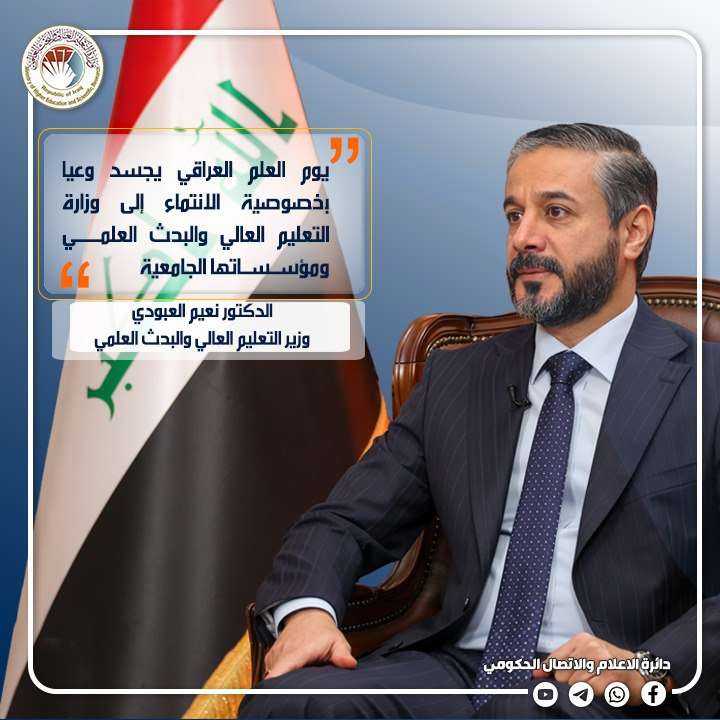 التزاما وعملا برؤيتها لترسيخ بيئة محفّزة للتميّز والإبداع تعلن وزارة التعليم العالي والبحث العلمي إطلاق التقديم الإلكتروني إلى جوائز يوم العلم العراقي الذي يستمر حتى يوم الأحد الموافق 2025/8/10.