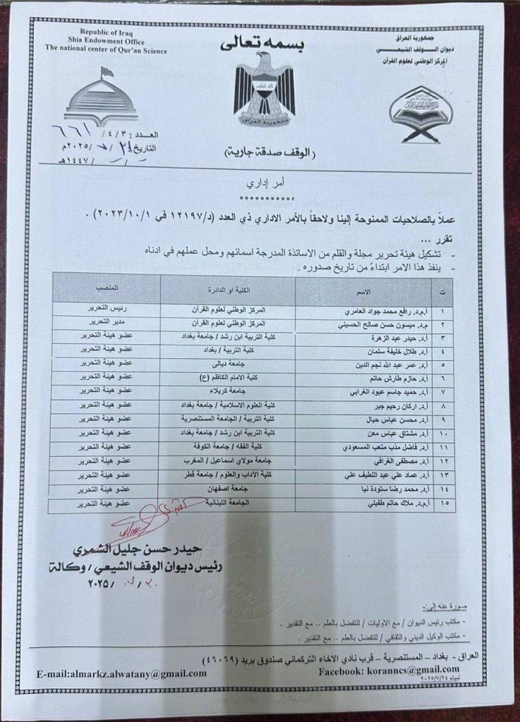 للعام الرابع على التوالي، جُدِّد اعتماد الأستاذ الدكتور حميد جاسم عبود الغرابي، التدريسي في كلية العلوم الإسلامية بجامعة كربلاء، عضوا في هيئة تحرير مجلة “والقلم” المحكمة، الصادرة عن ديوان الوقف الشيعي، وهي إحدى المجلات العلمية الرصينة المعنية بنشر البحوث في مجالات العلوم الإسلامية والإنسانية.