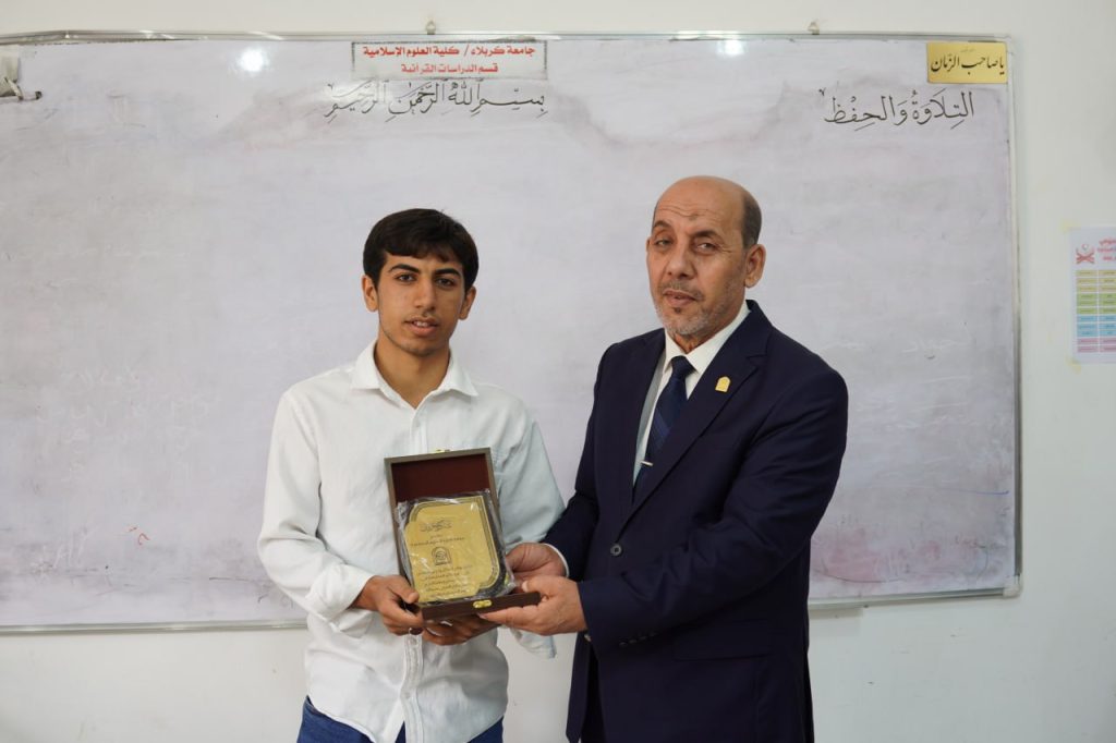 كرّم الأستاذ الدكتور محمد حسين عبود الطائي، عميد كلية العلوم الإسلامية، الطالب حيدر طايع تثميناً لتميّزه وإبداعه في تلاوة القرآن الكريم ومشاركاته المتميزة في النشاطات القرآنية على مستوى جامعة كربلاء وخارجها.