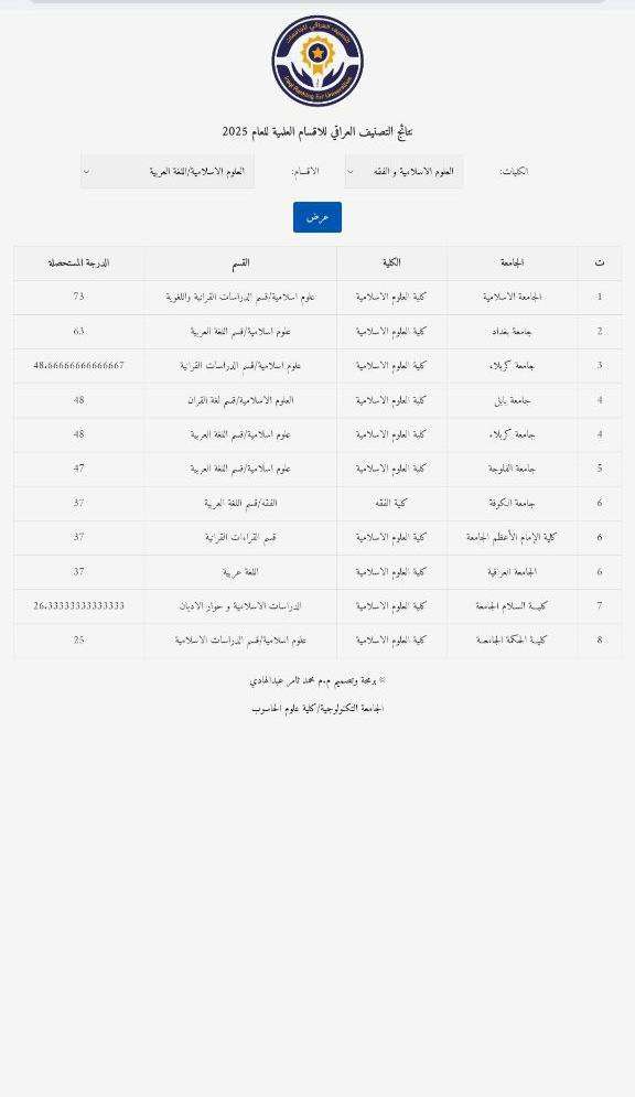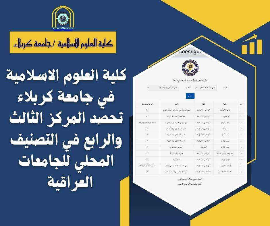 حققت أقسام كلية العلوم الإسلامية في جامعة كربلاء مراكز متقدمة ضمن التصنيف العلمي للجامعات والكليات لعام 2025، في إنجازٍ علمي يعكس المستوى الأكاديمي الرصين والجهود المبذولة من قبل الهيئات التدريسية والإدارية في الكلية.